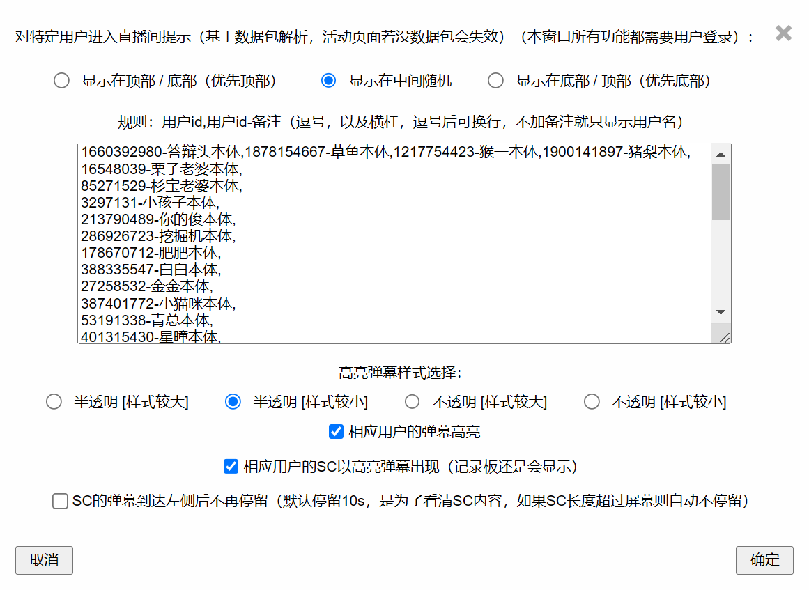 可设置指定用户,在这些用户进入直播间的时候,会弹幕提示; 这些用户的弹幕高亮;这些用户的SC转高亮弹幕